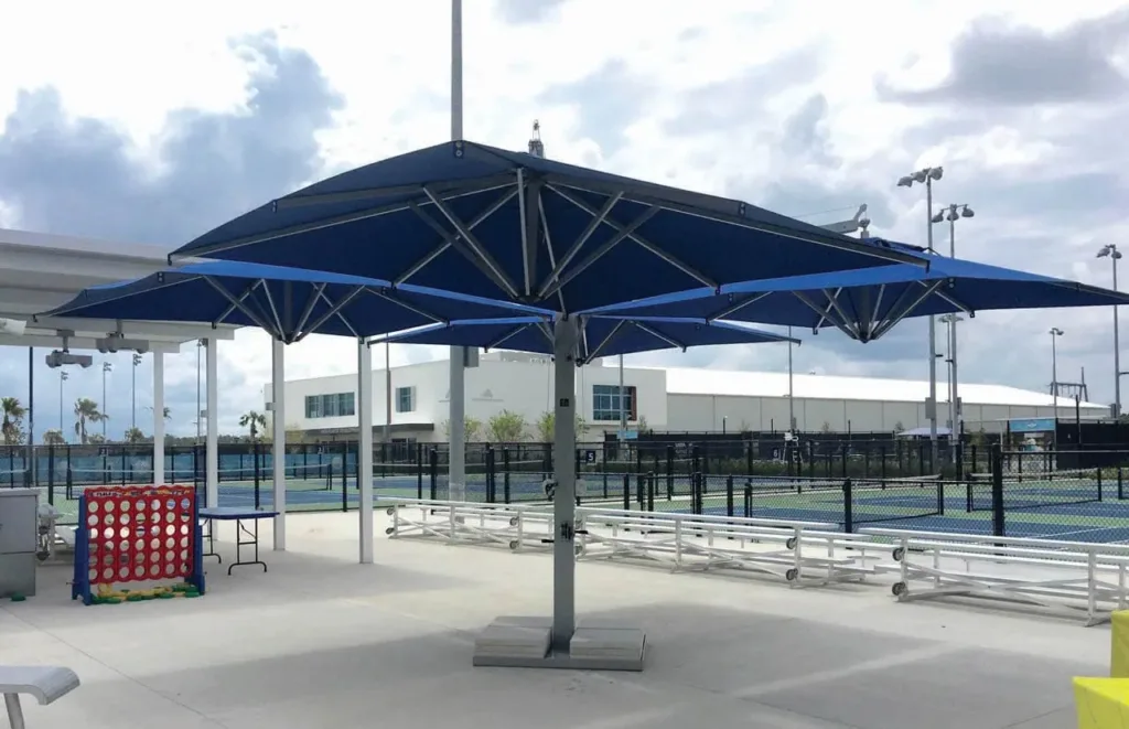 Composto da 4 ombrelloni, permette grandi zone d’ombra con il minimo ingombro della struttura.