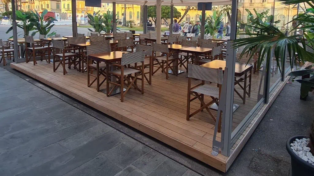 Pedana in Legno per Dehor, completa di sottoscocca con tubolare in alluminio, rivestimento in doghe in legno per esterno e profilo perimetrale
