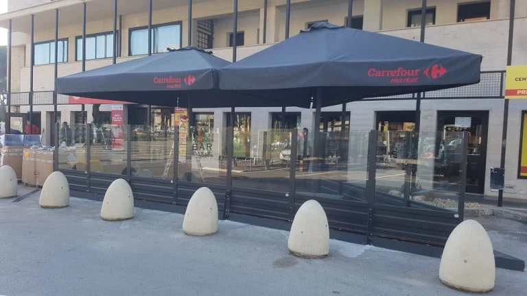 Sistema modulare di arredo con ancoraggi fissi al suolo. E’ costituito da profili in alluminio. L mm. 1500 max, H mm. 1650, vetro temperato mm. 8 di spessore.