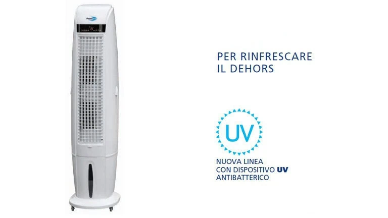 DISPOSITIVO UV ANTIBATTERICO. I rinfrescatori hanno una peculiarità molto importante per la salute delle persone: sono dotati di una lampada UV, posta nel serbatoio, per sterilizzare l’acqua e per evitare che si formino dei batteri (tipo legionella od altri) e delle muffe.